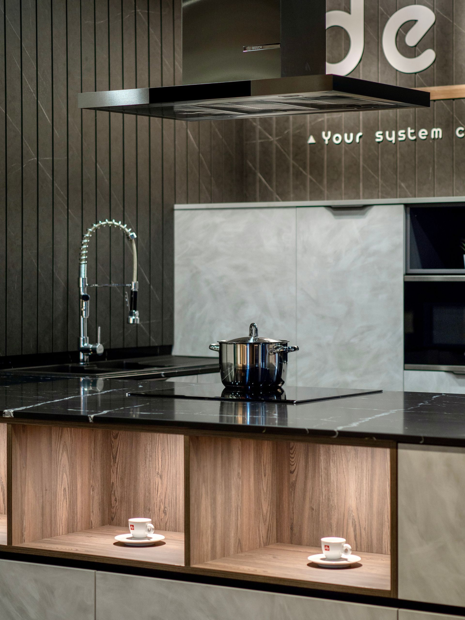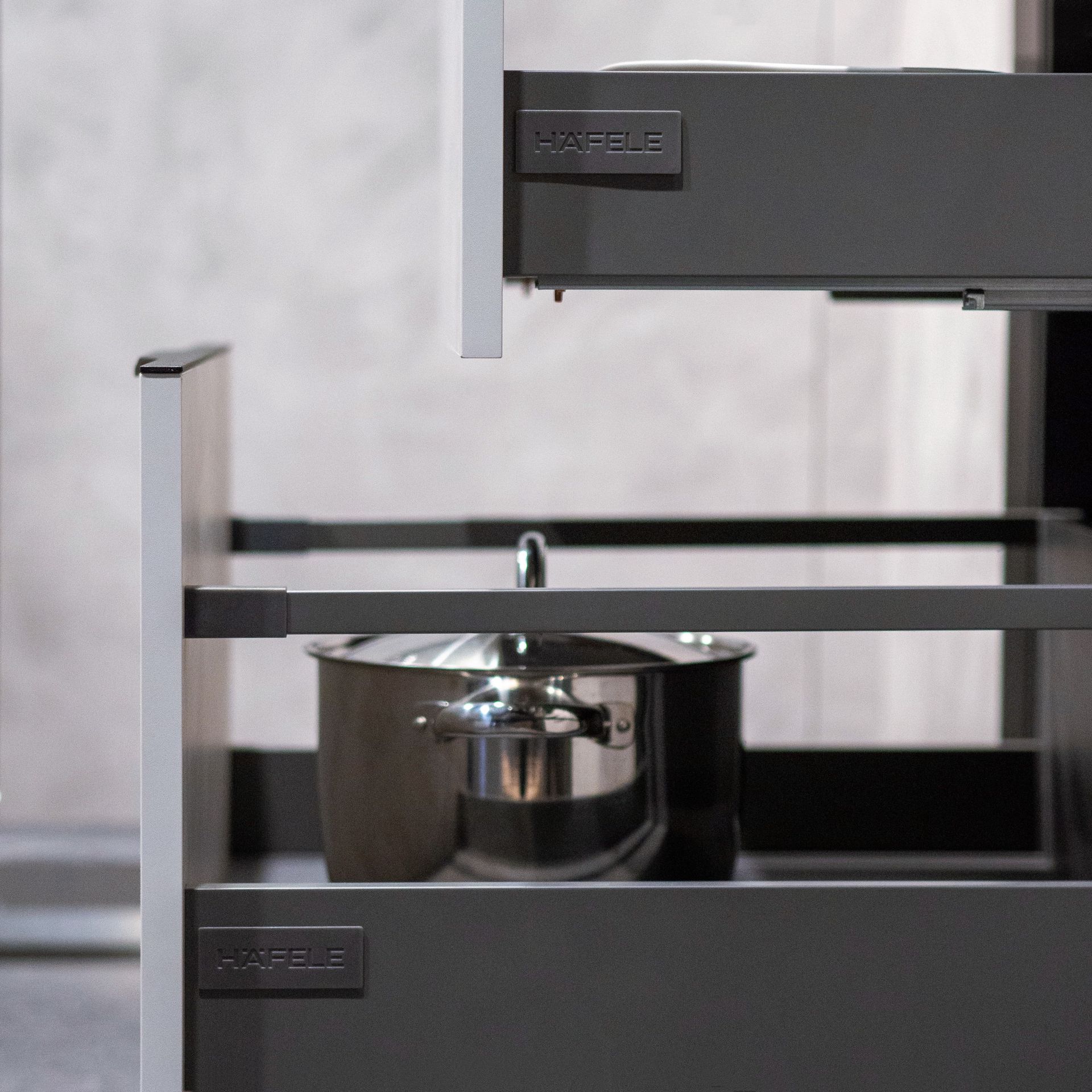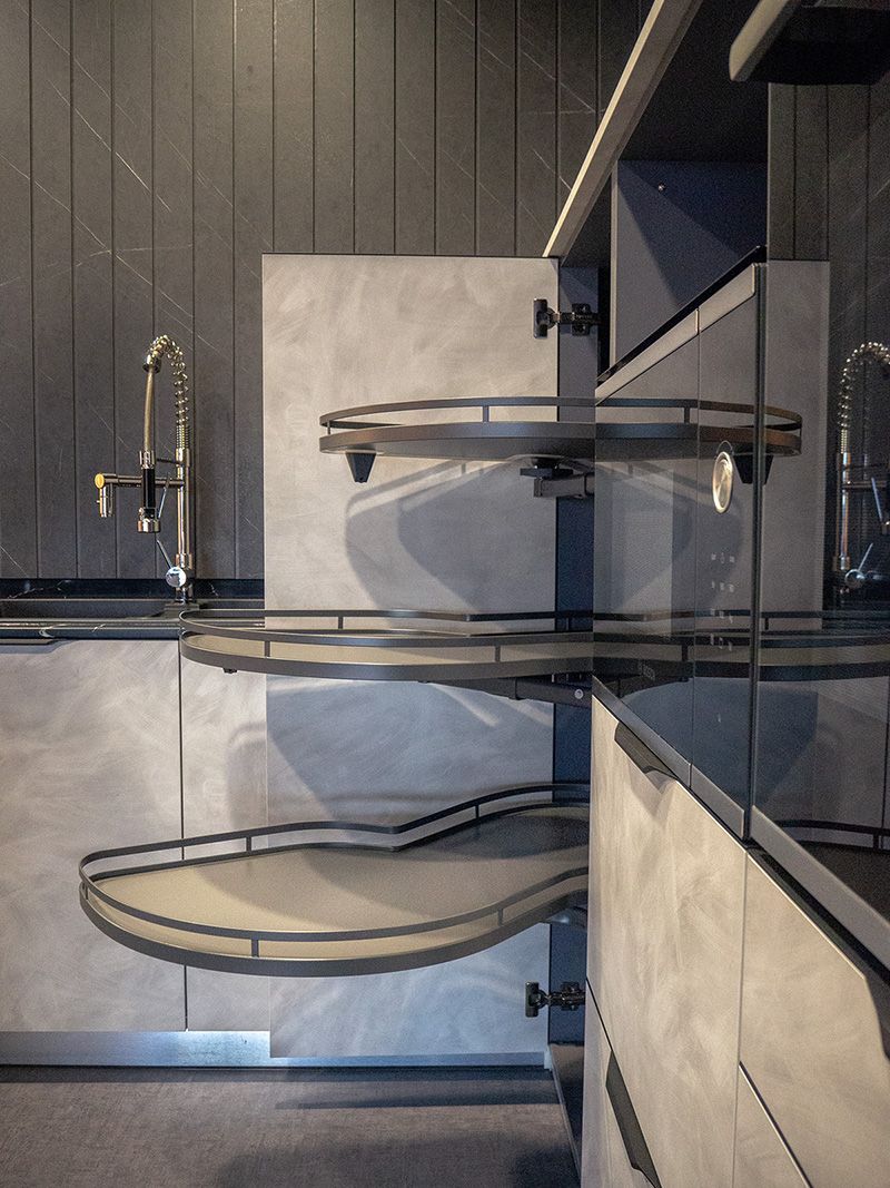 A kitchen that embodies a sense of industrial style with light grey tone.