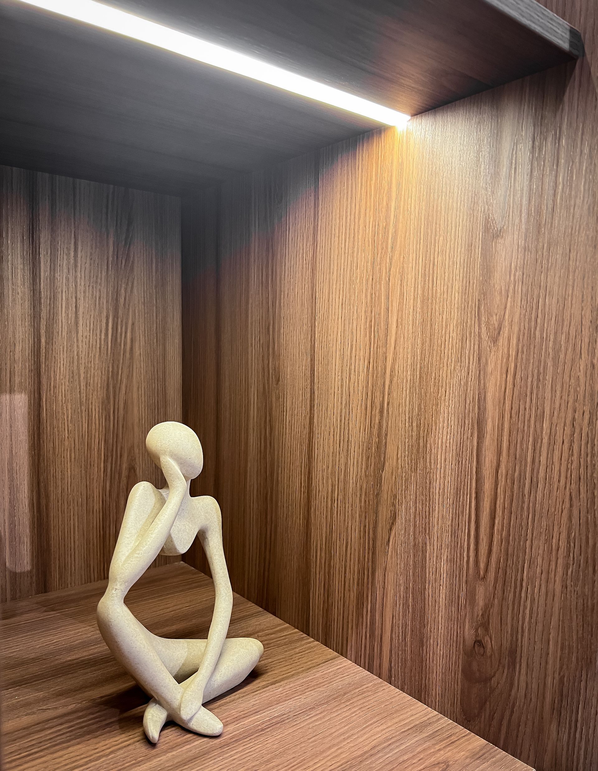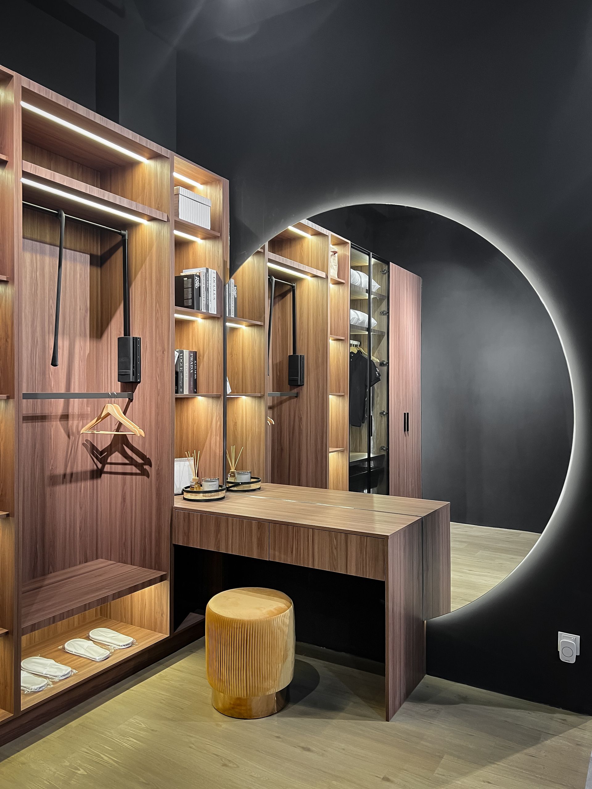 A wardrobe system designed for elegance and function. Featuring warm wood tone, sleek storage solutions, and a stunning round LED mirror that elevates your space.