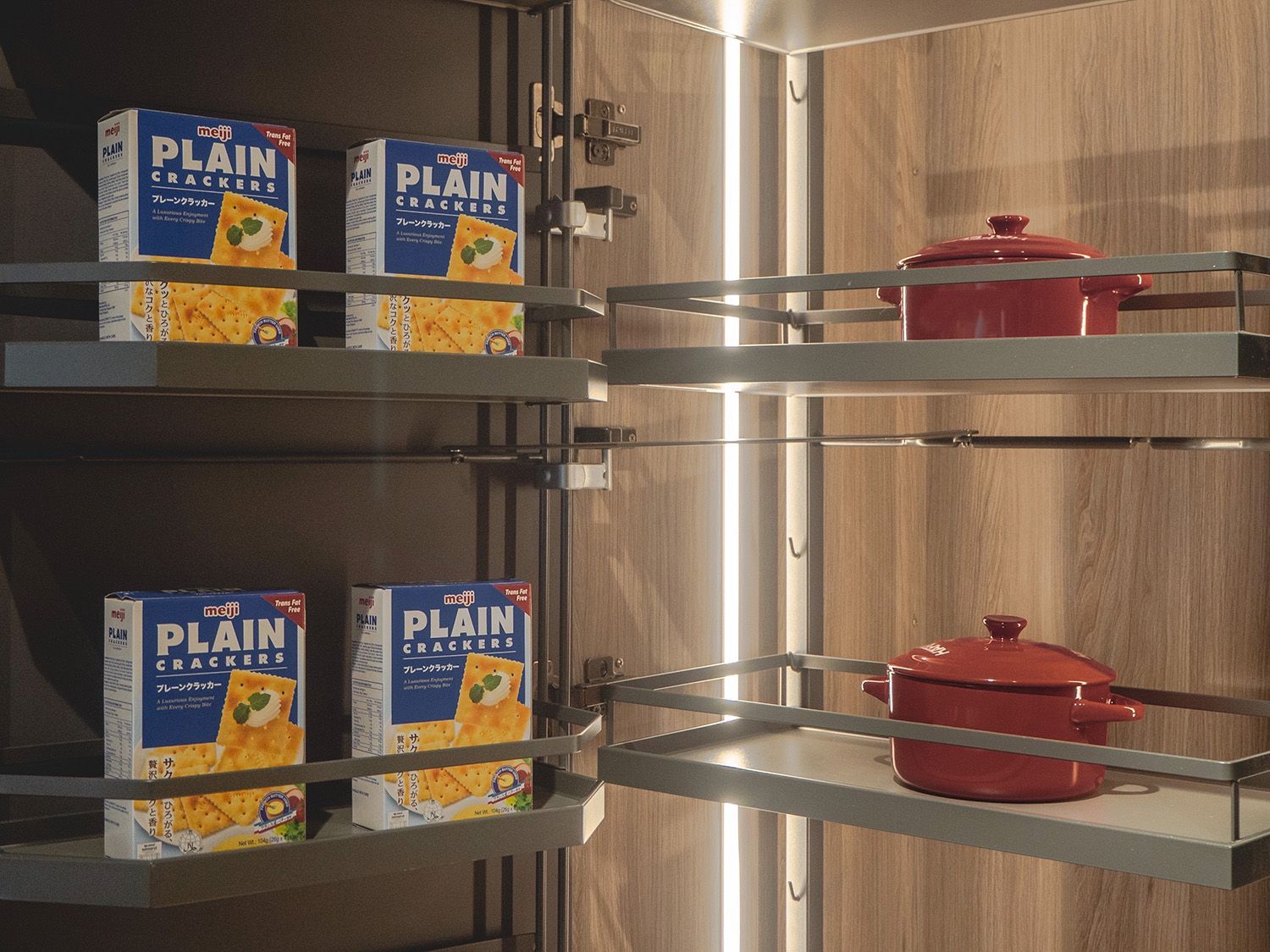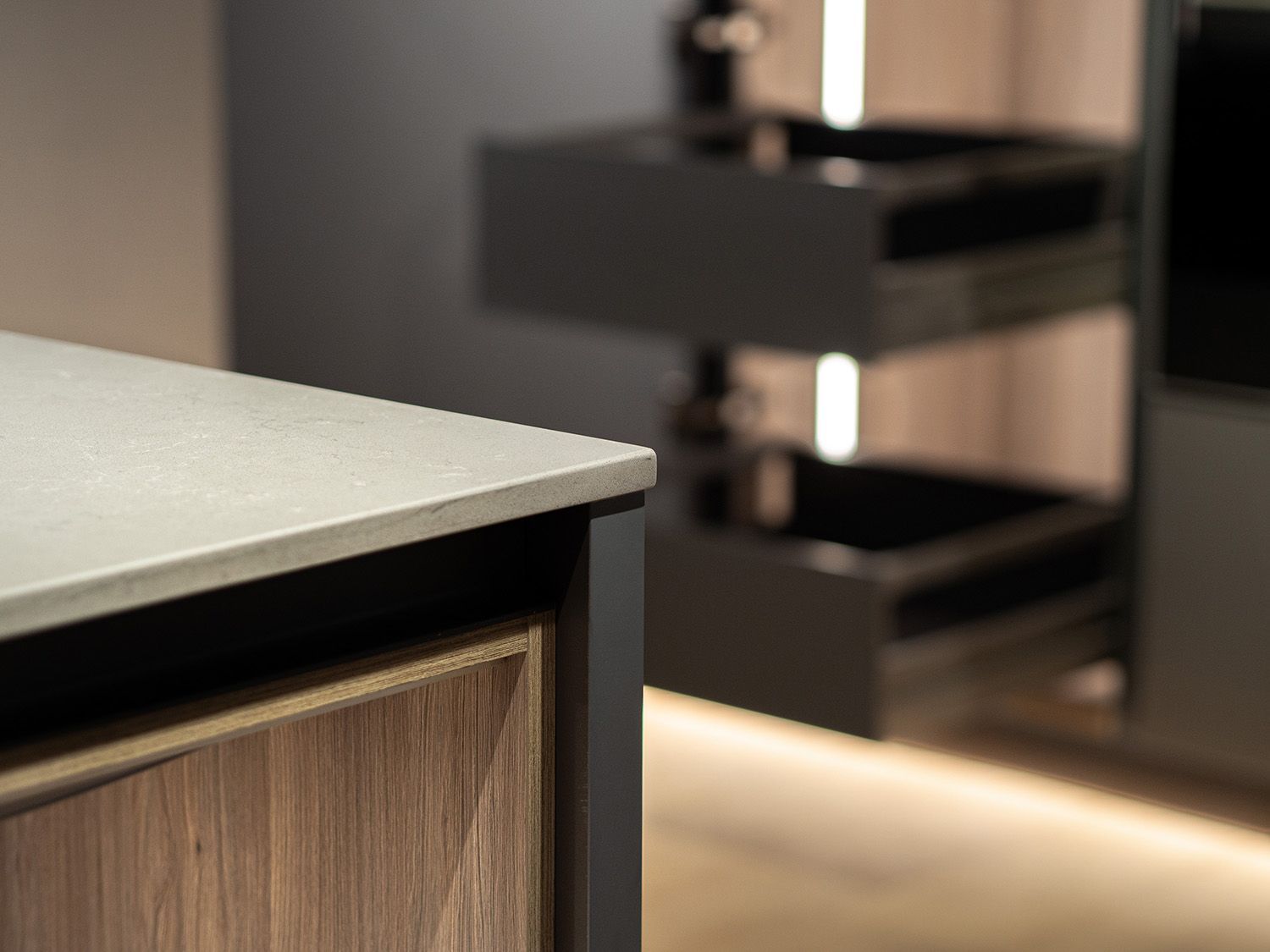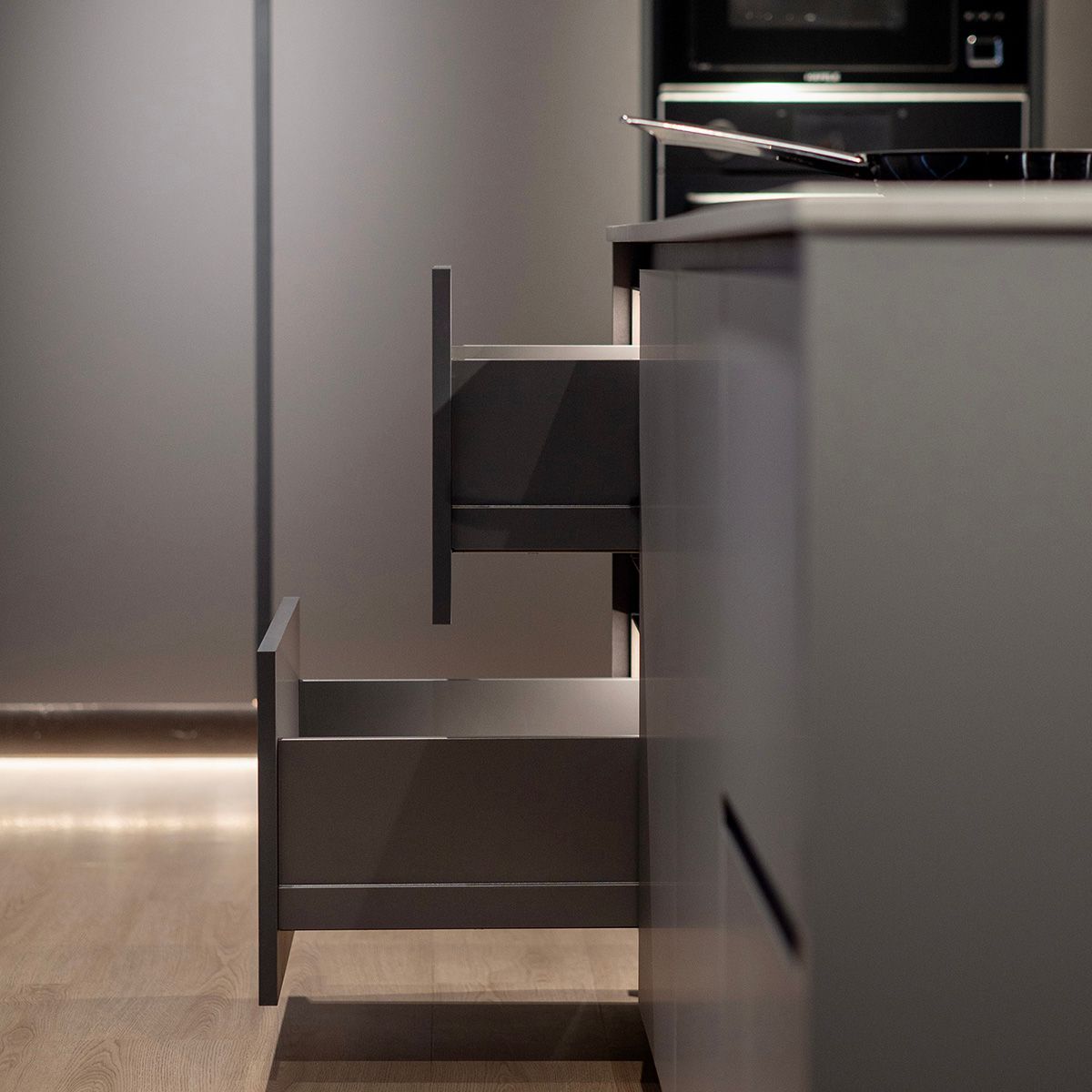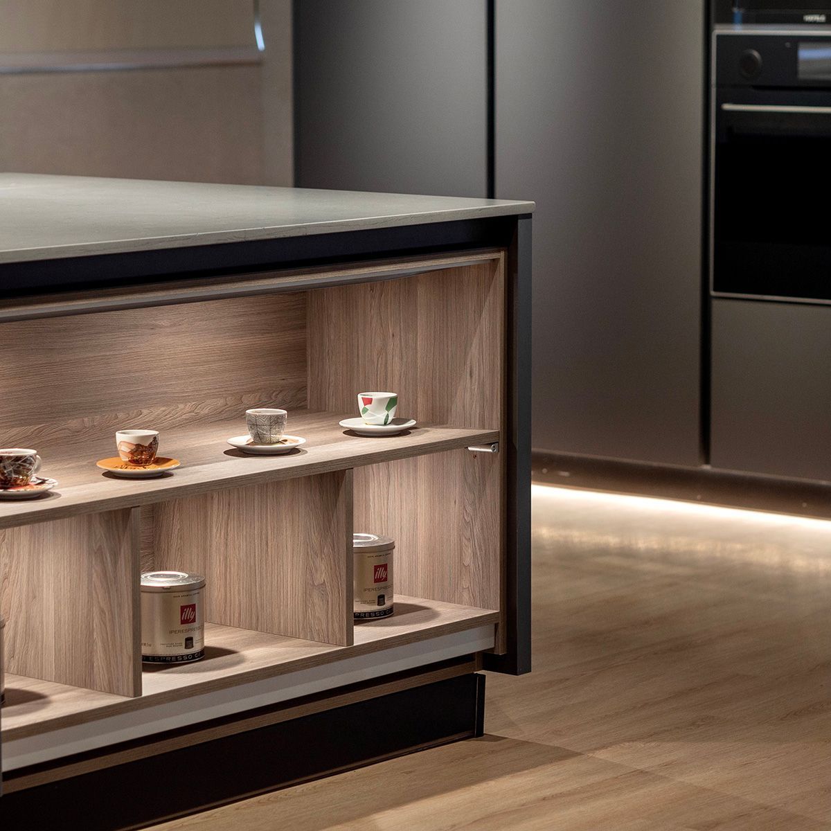 A kitchen where versatile storage accessories and innovative material merge to develop a space with high functionality and sophisticated style.