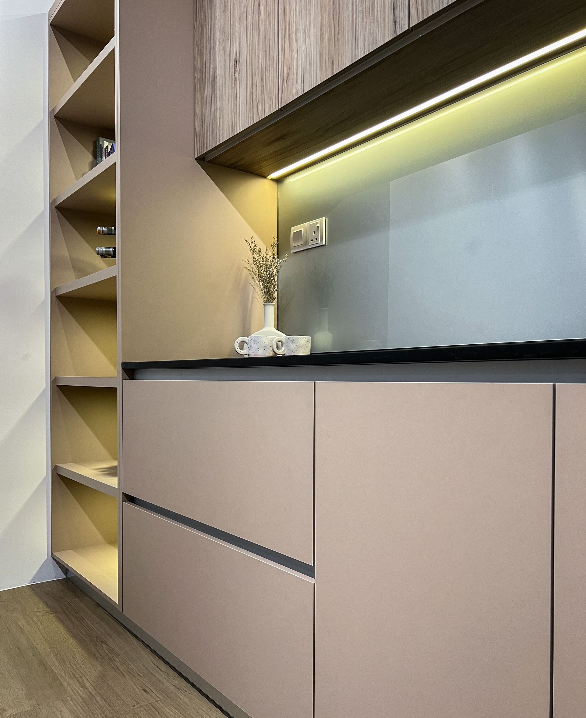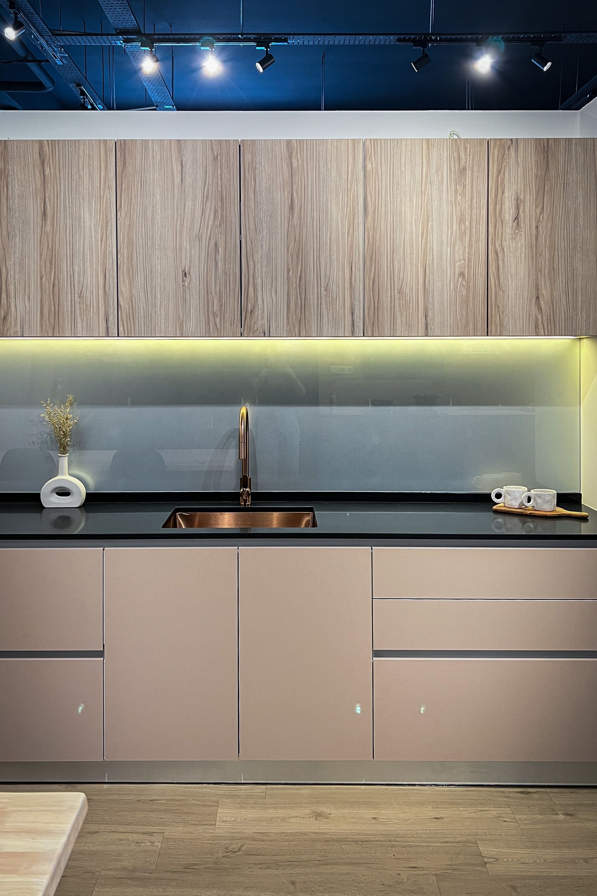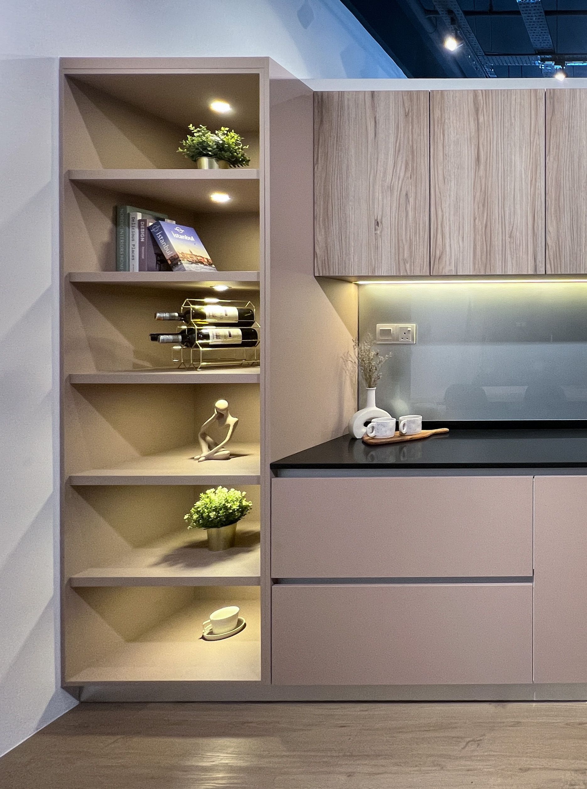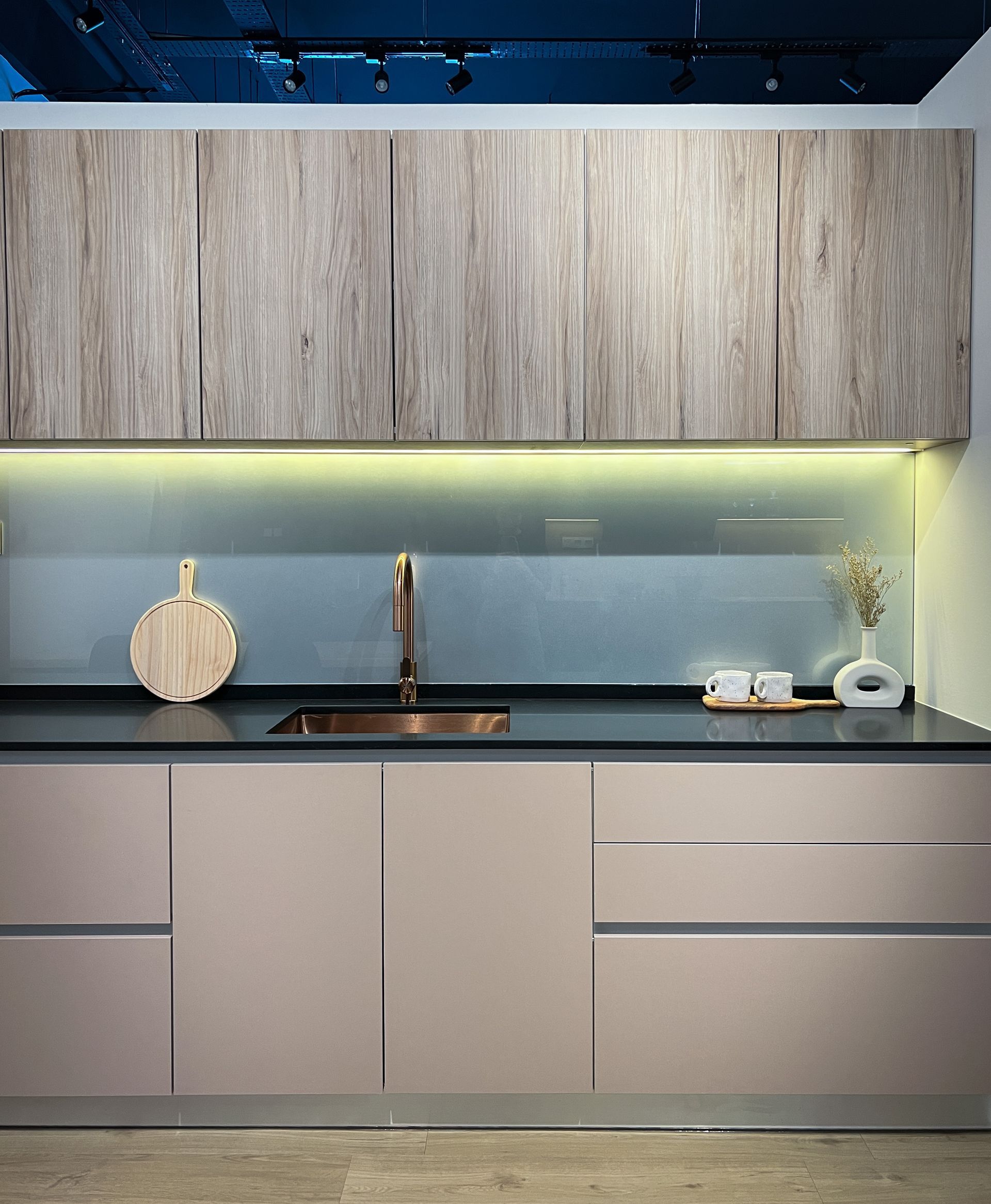 A kitchen that radiates warmth and charm, wrapped in soft pastel blush tones.