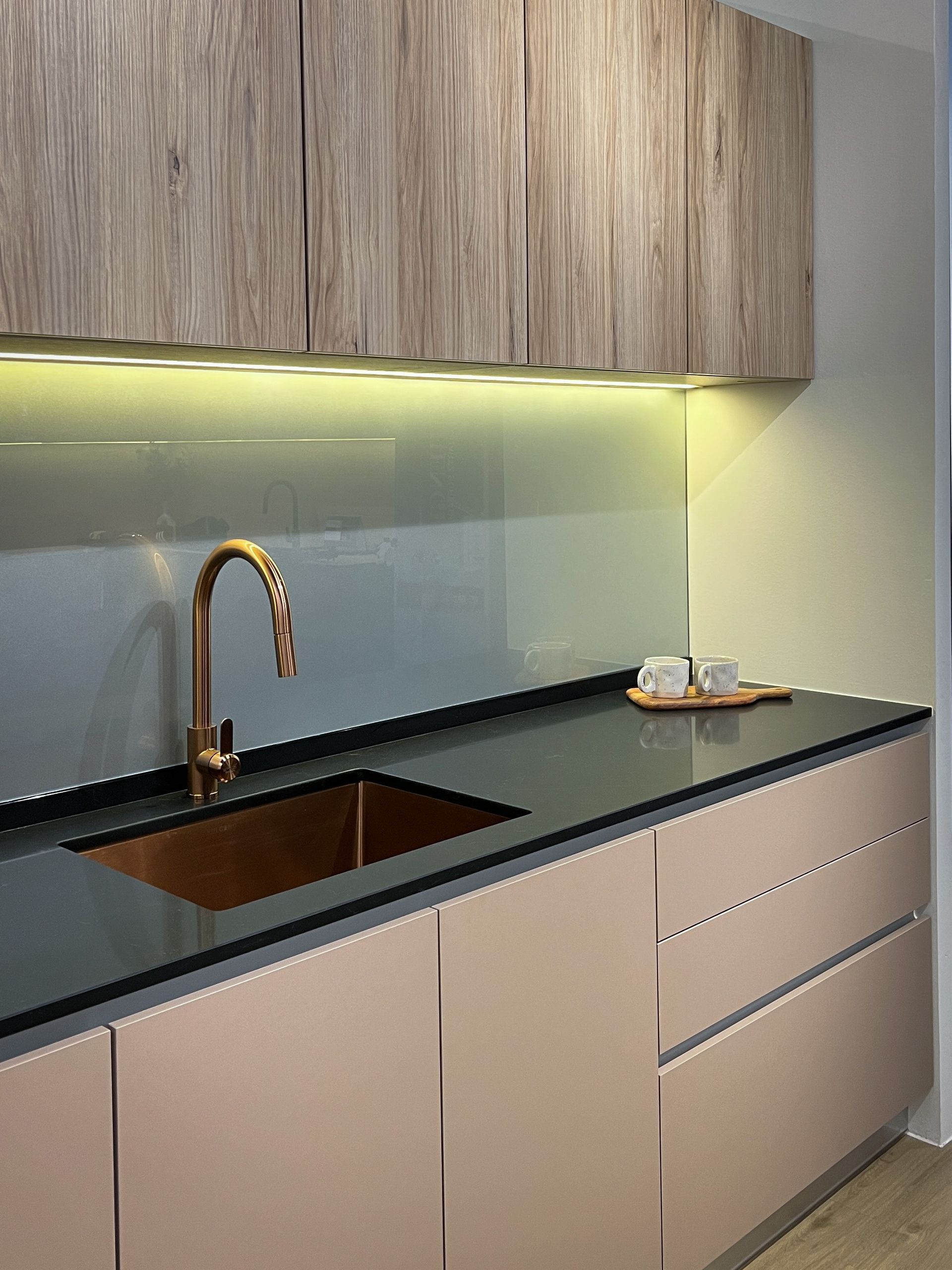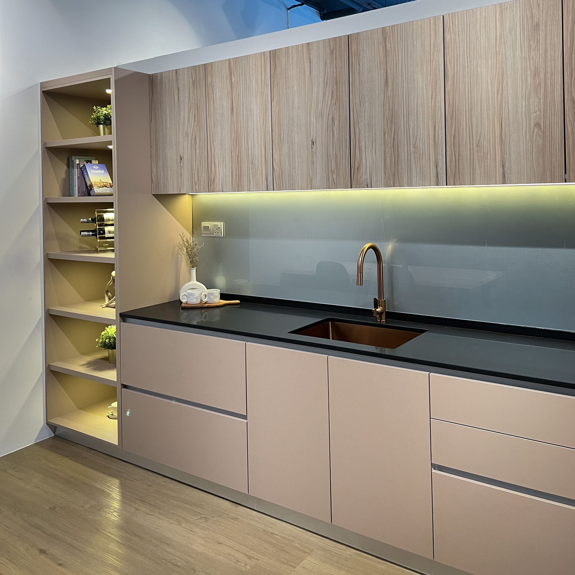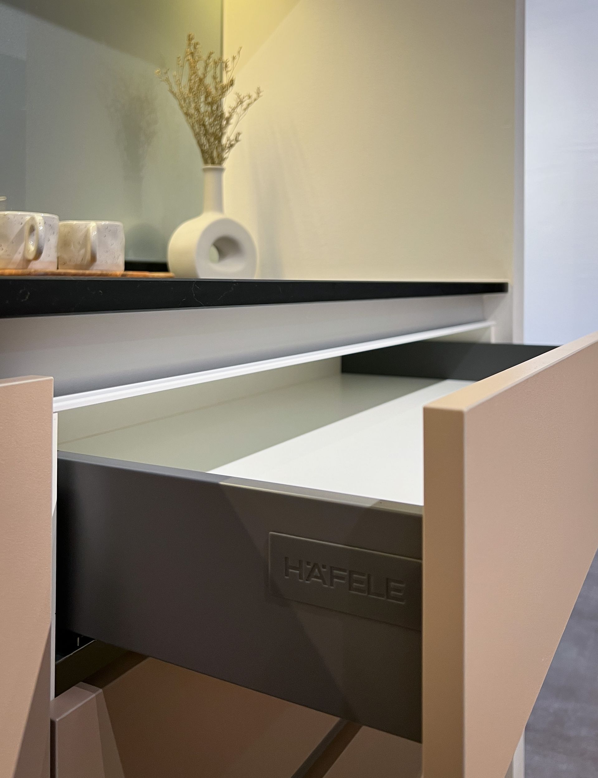 A kitchen that radiates warmth and charm, wrapped in soft pastel blush tones.