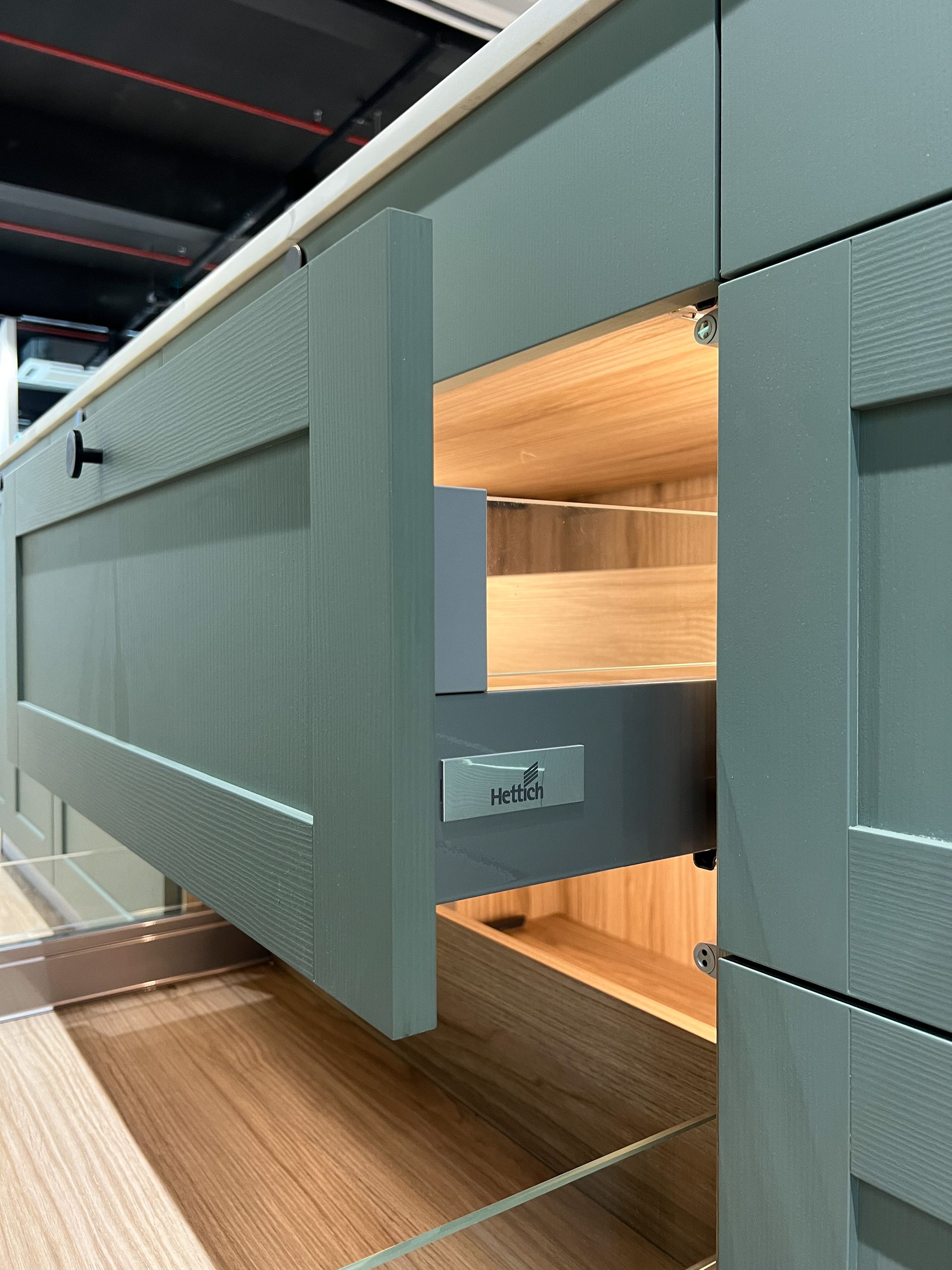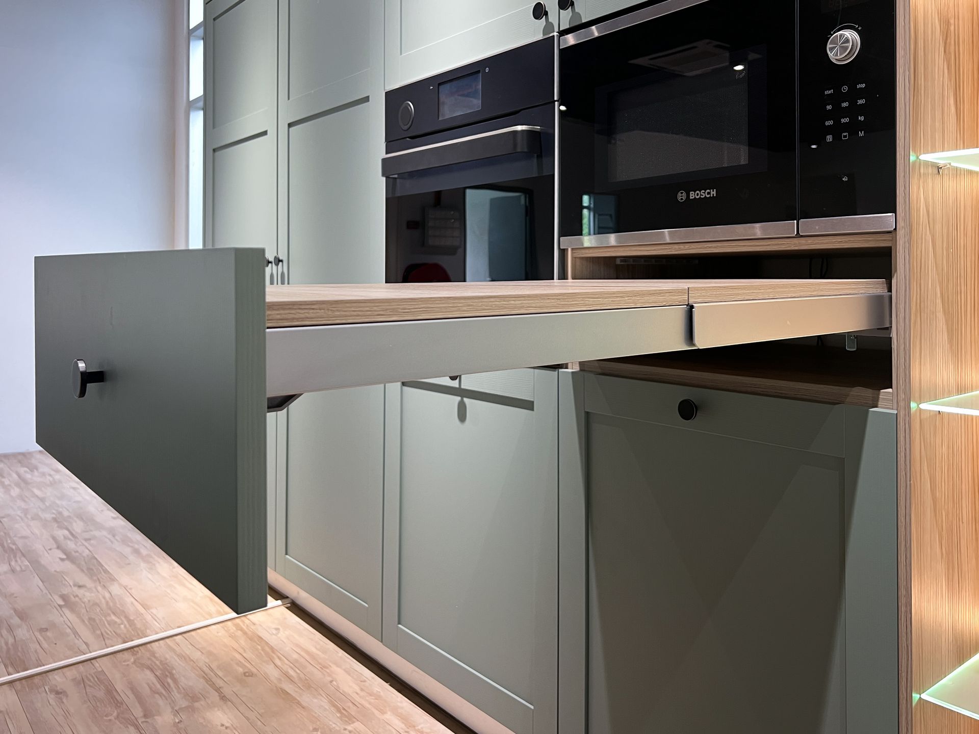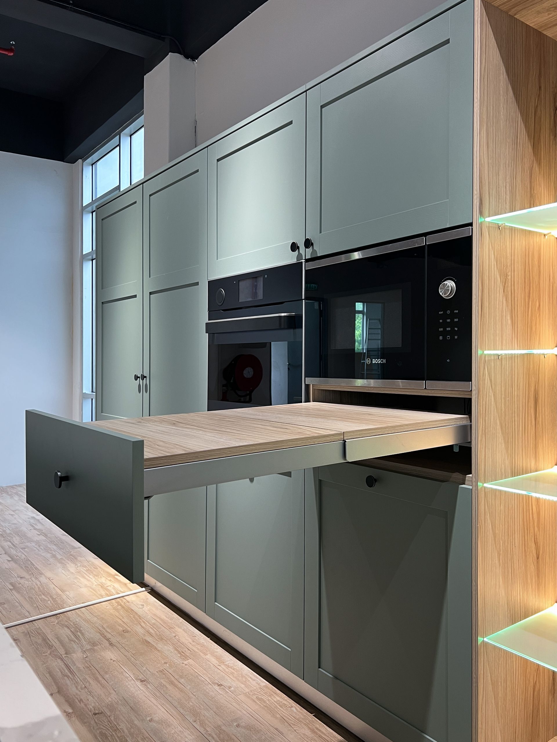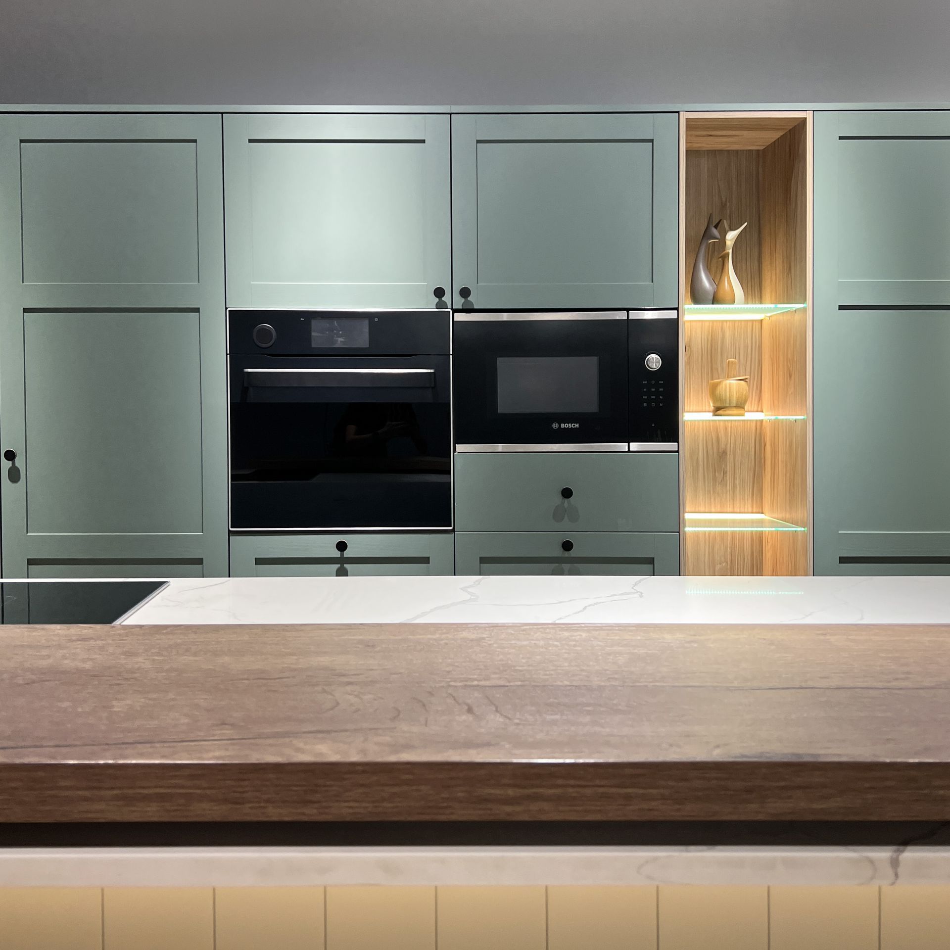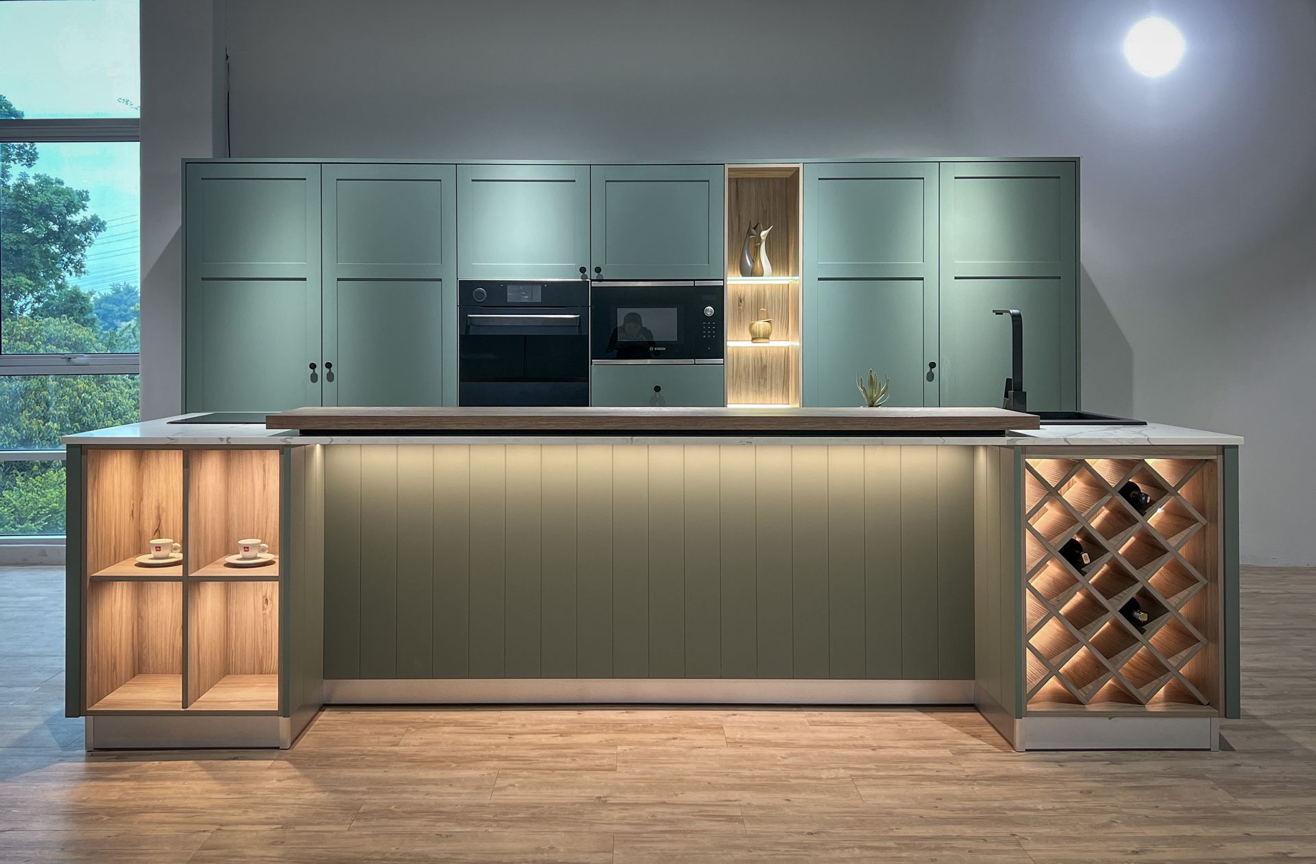 A kitchen full of fresh elegance, dressed in a rich emerald hue with a warm wood breakfast nook.