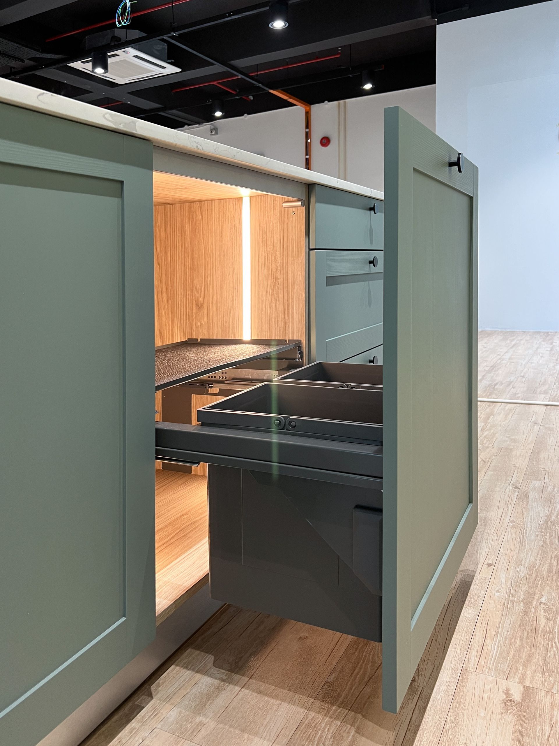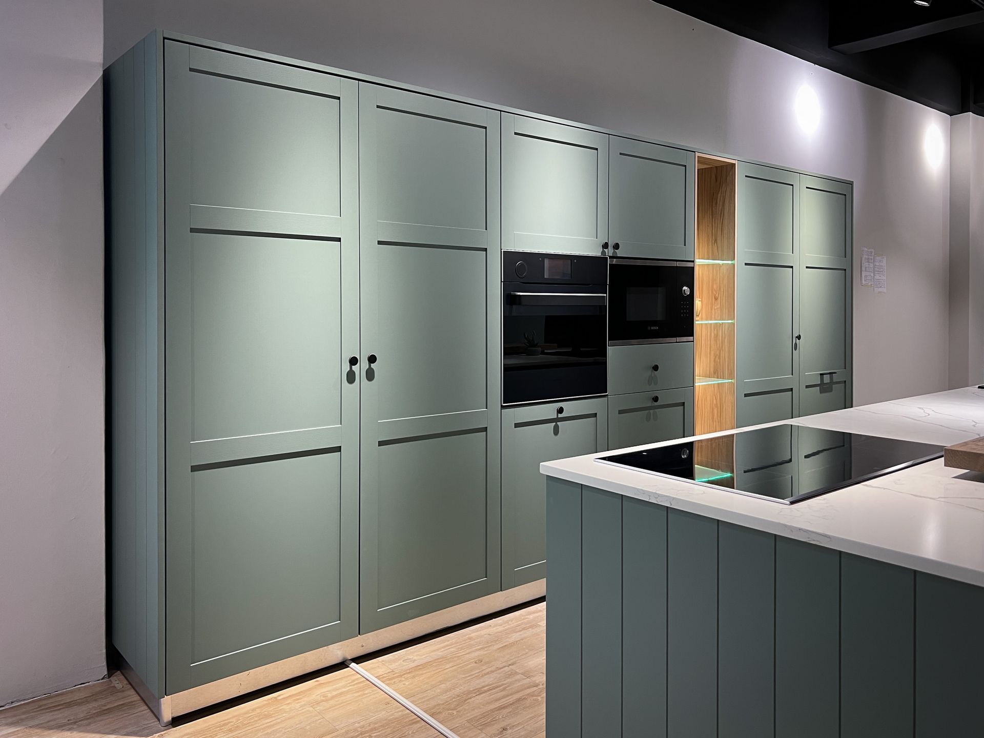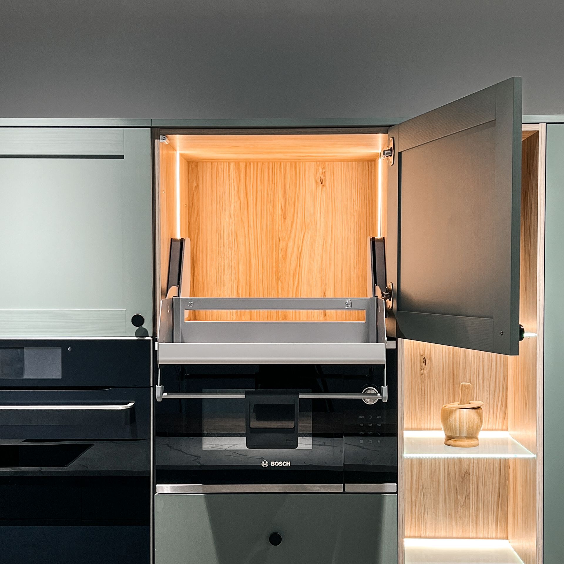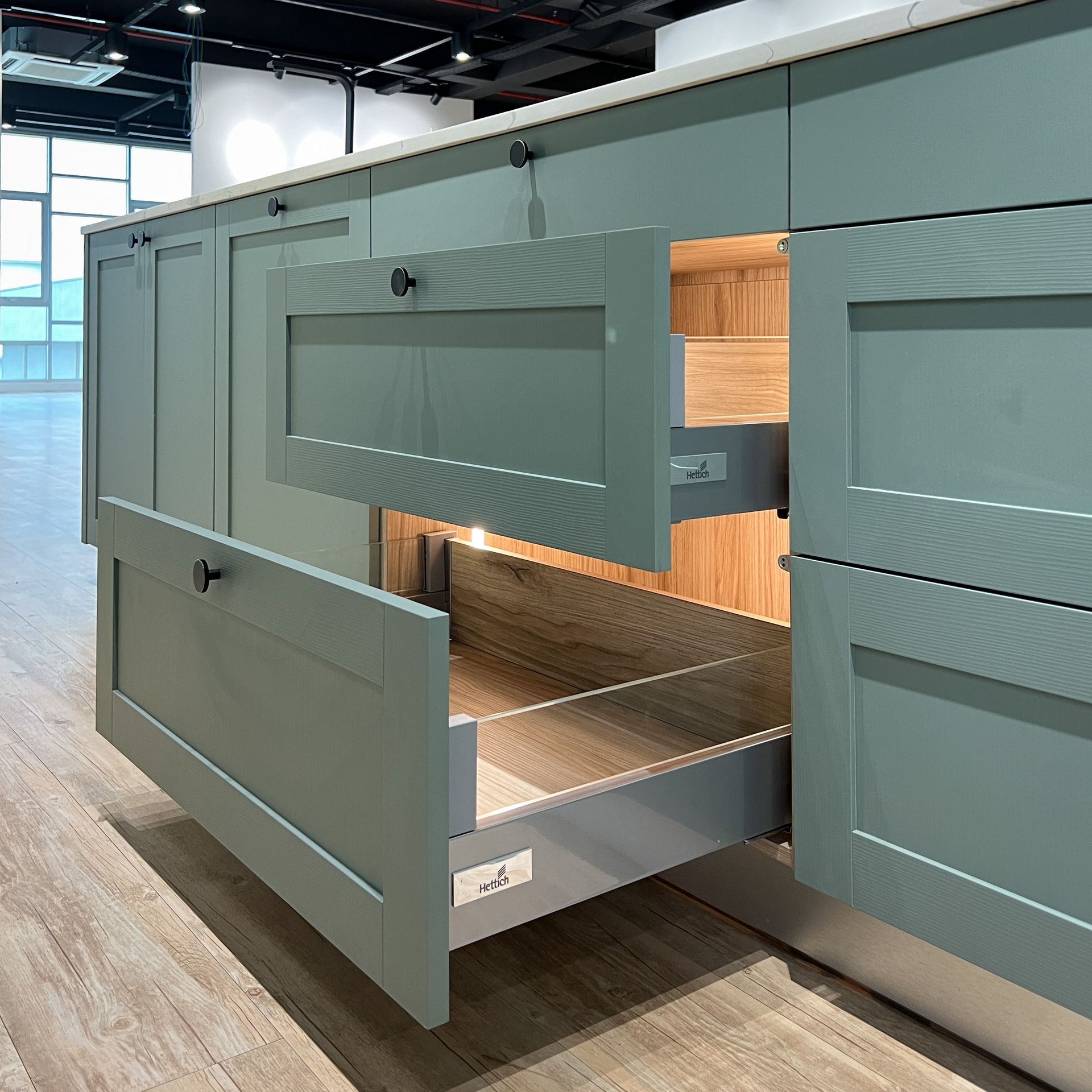 A kitchen full of fresh elegance, dressed in a rich emerald hue with a warm wood breakfast nook.