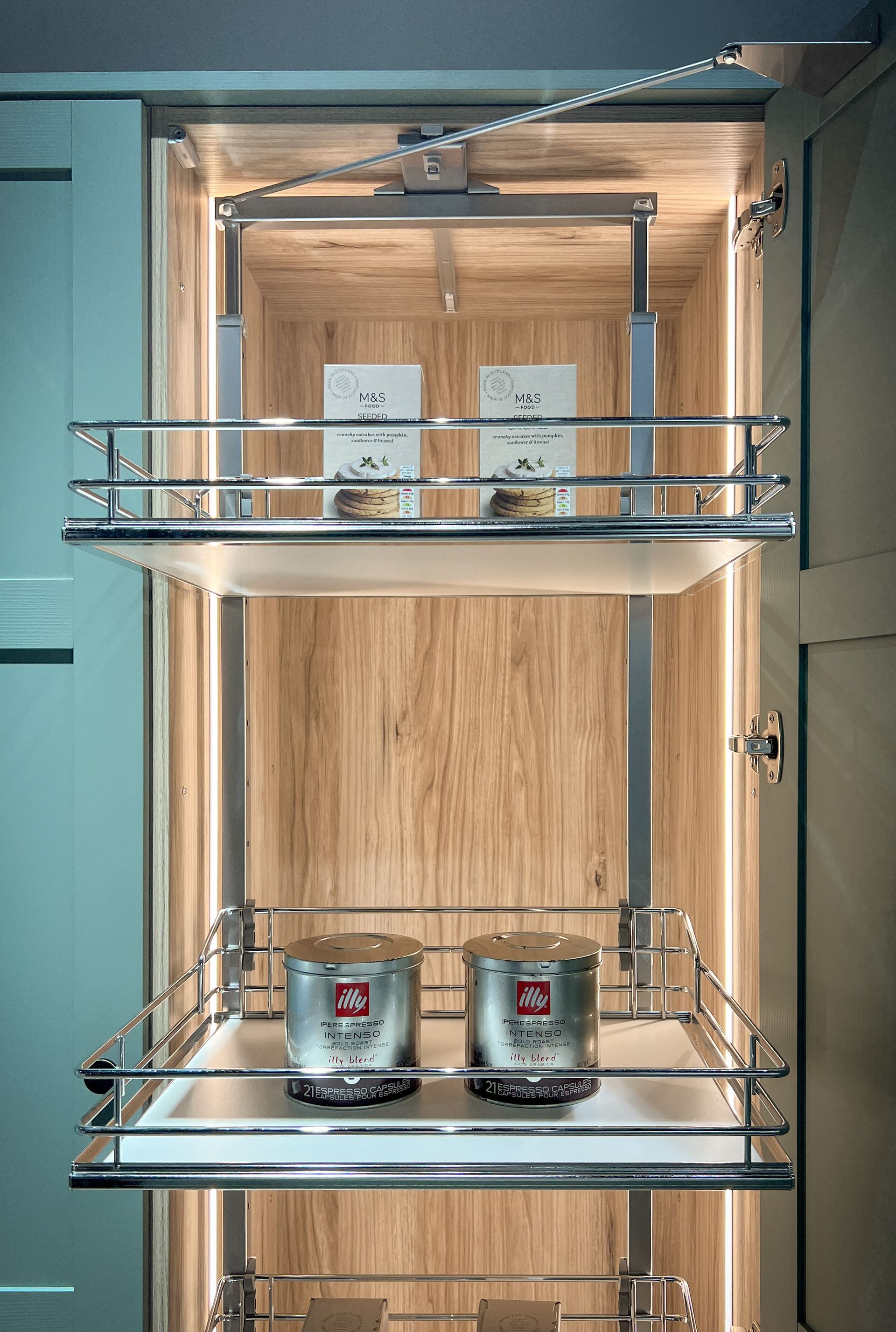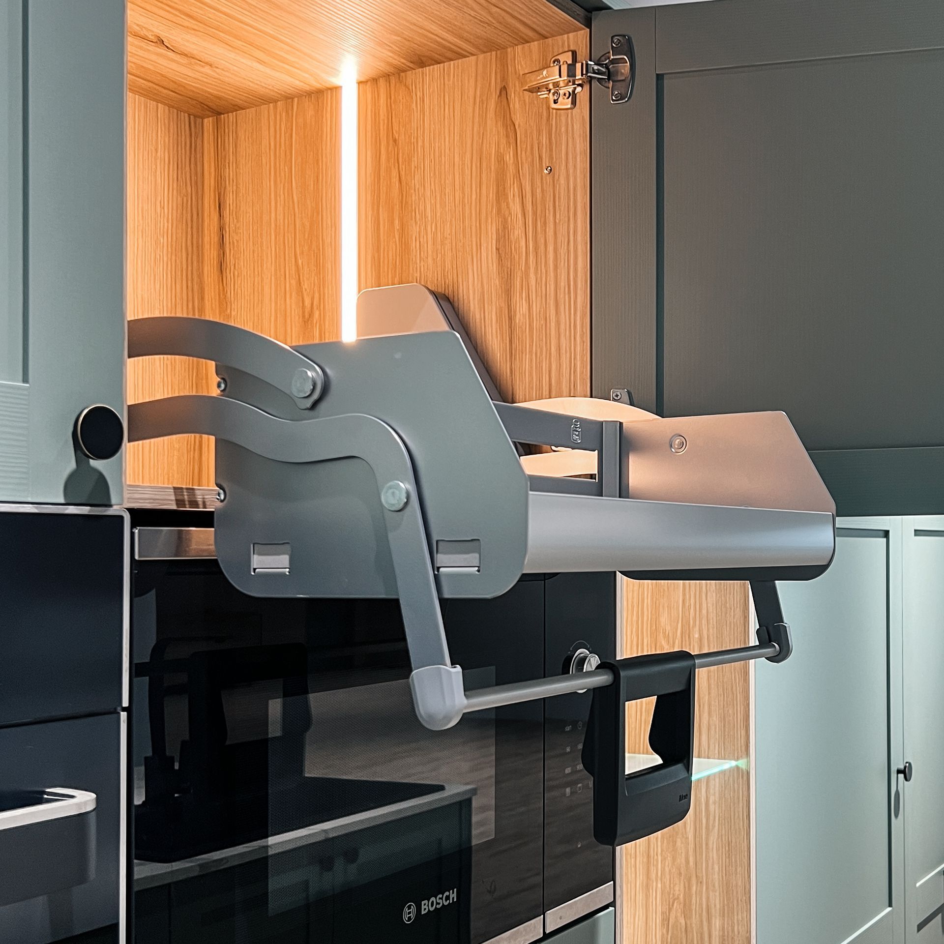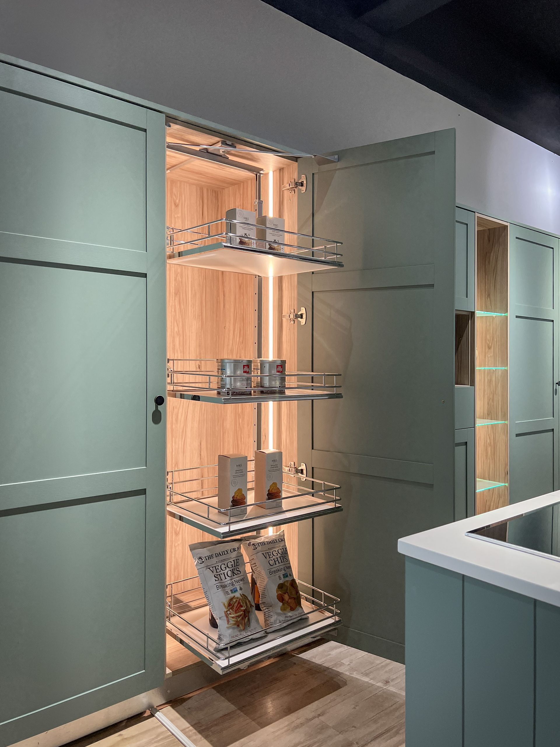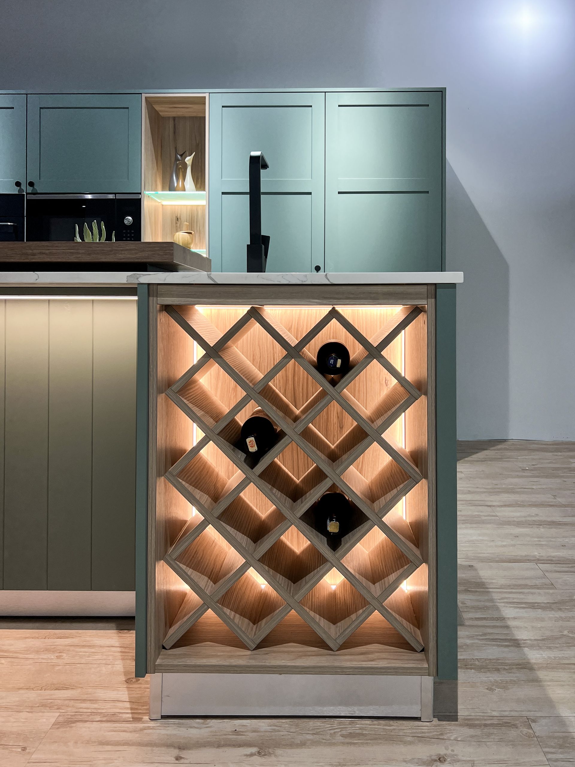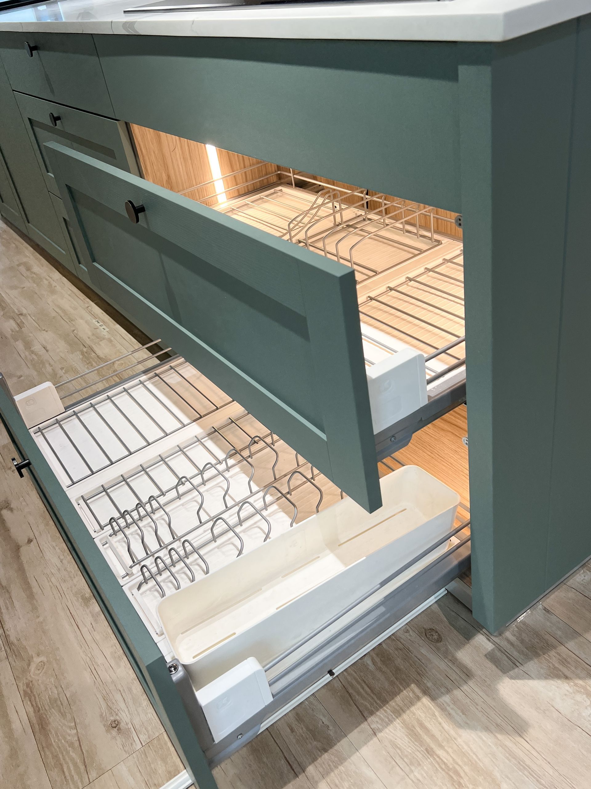 A kitchen full of fresh elegance, dressed in a rich emerald hue with a warm wood breakfast nook.