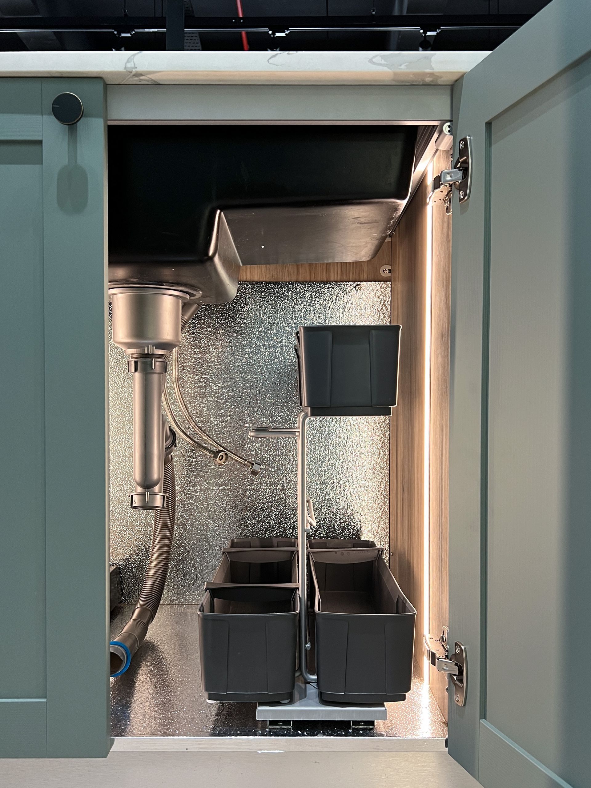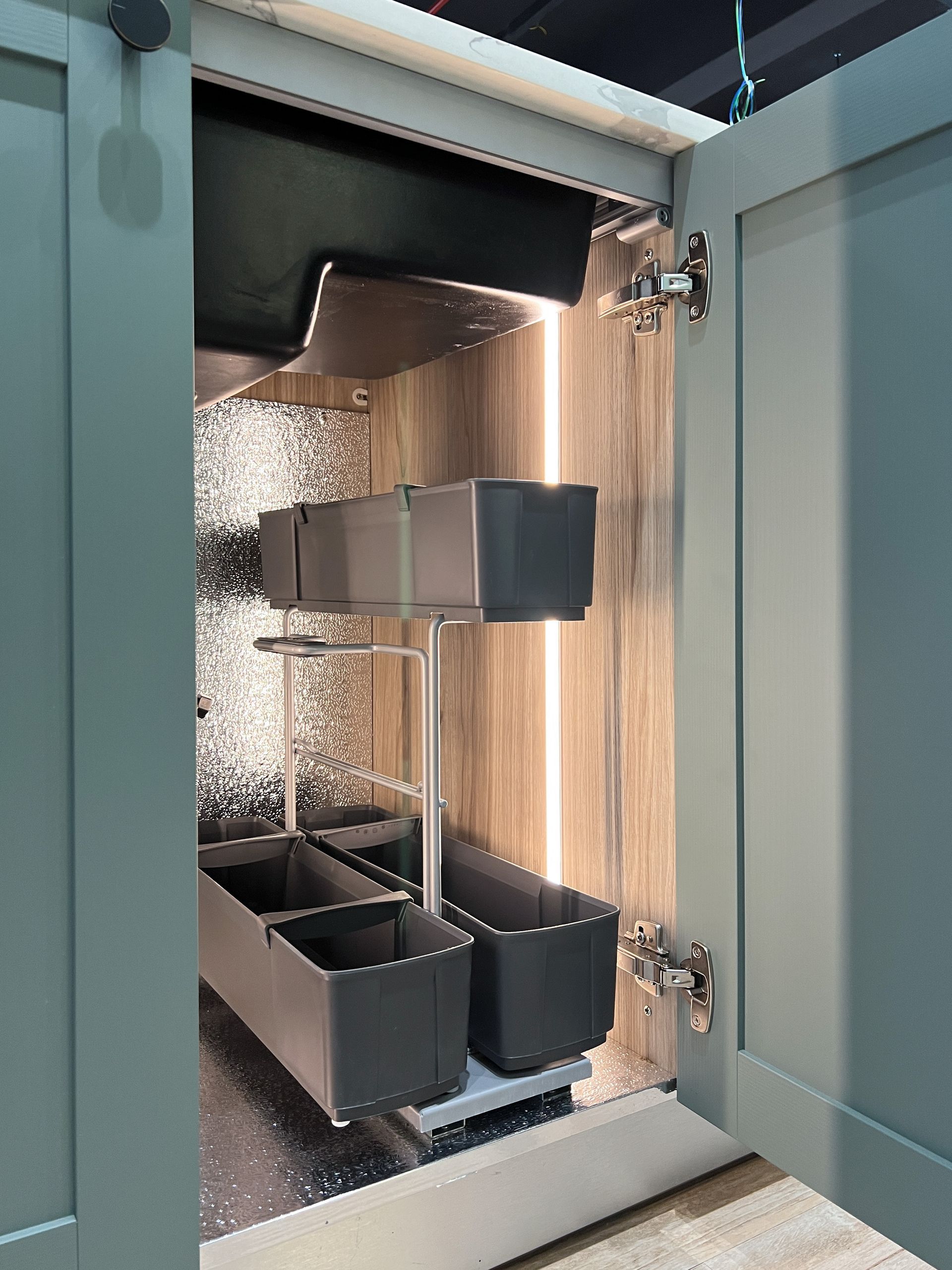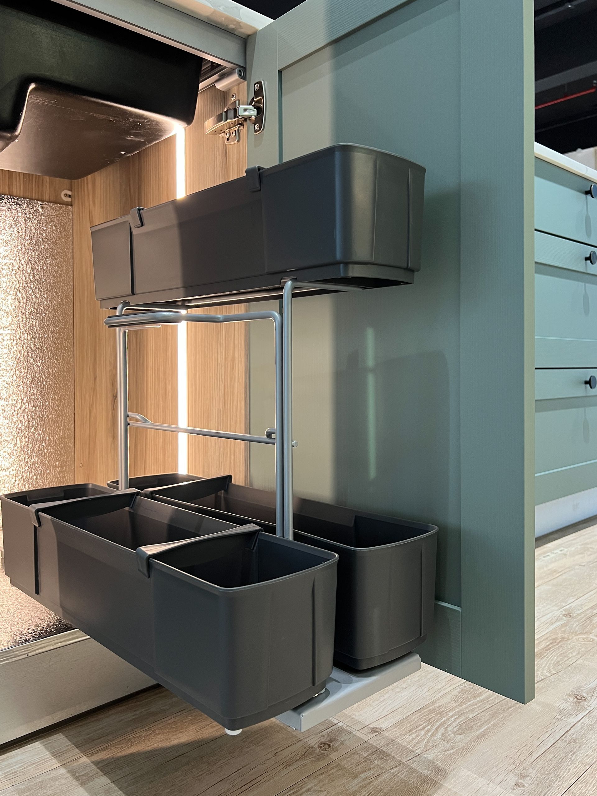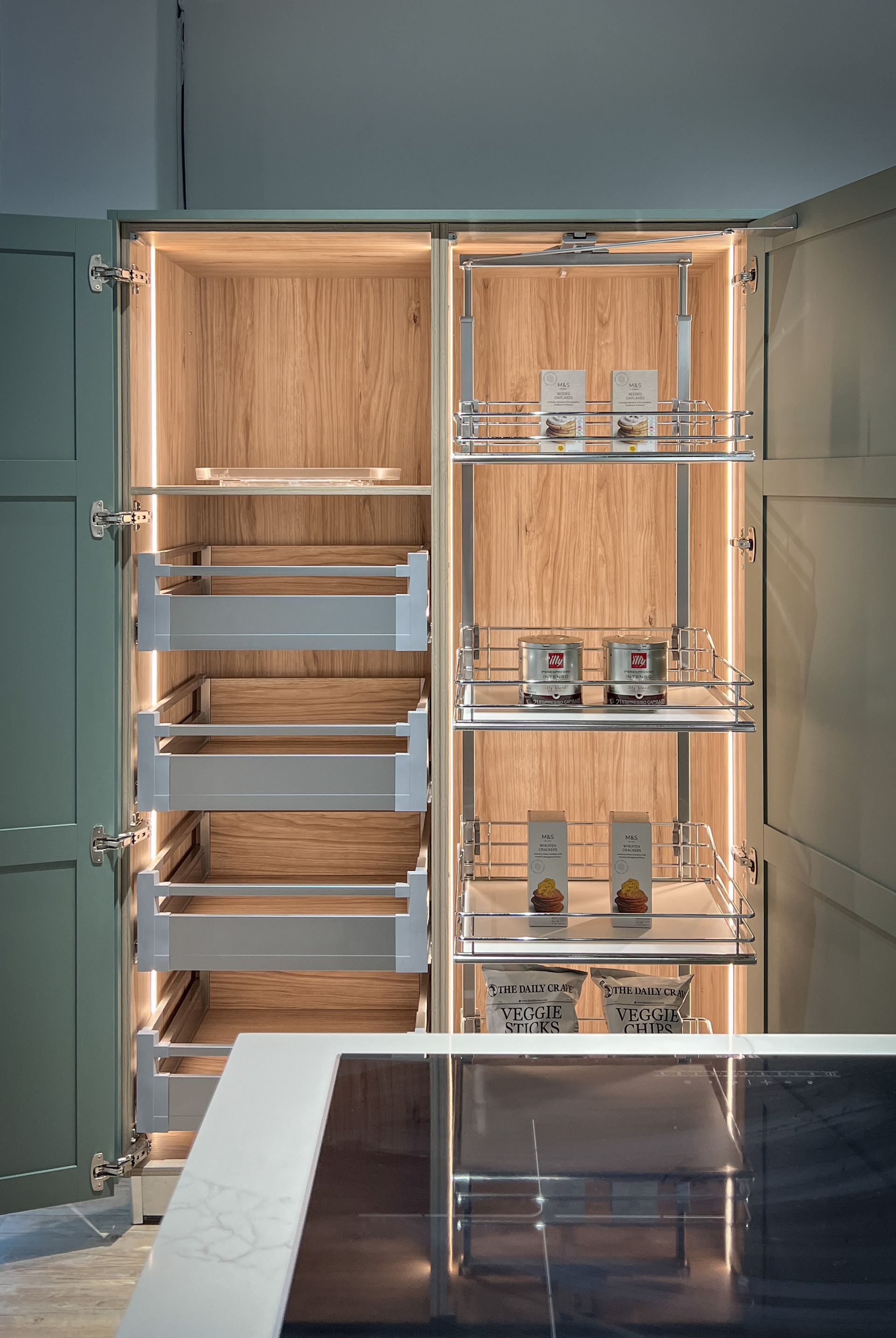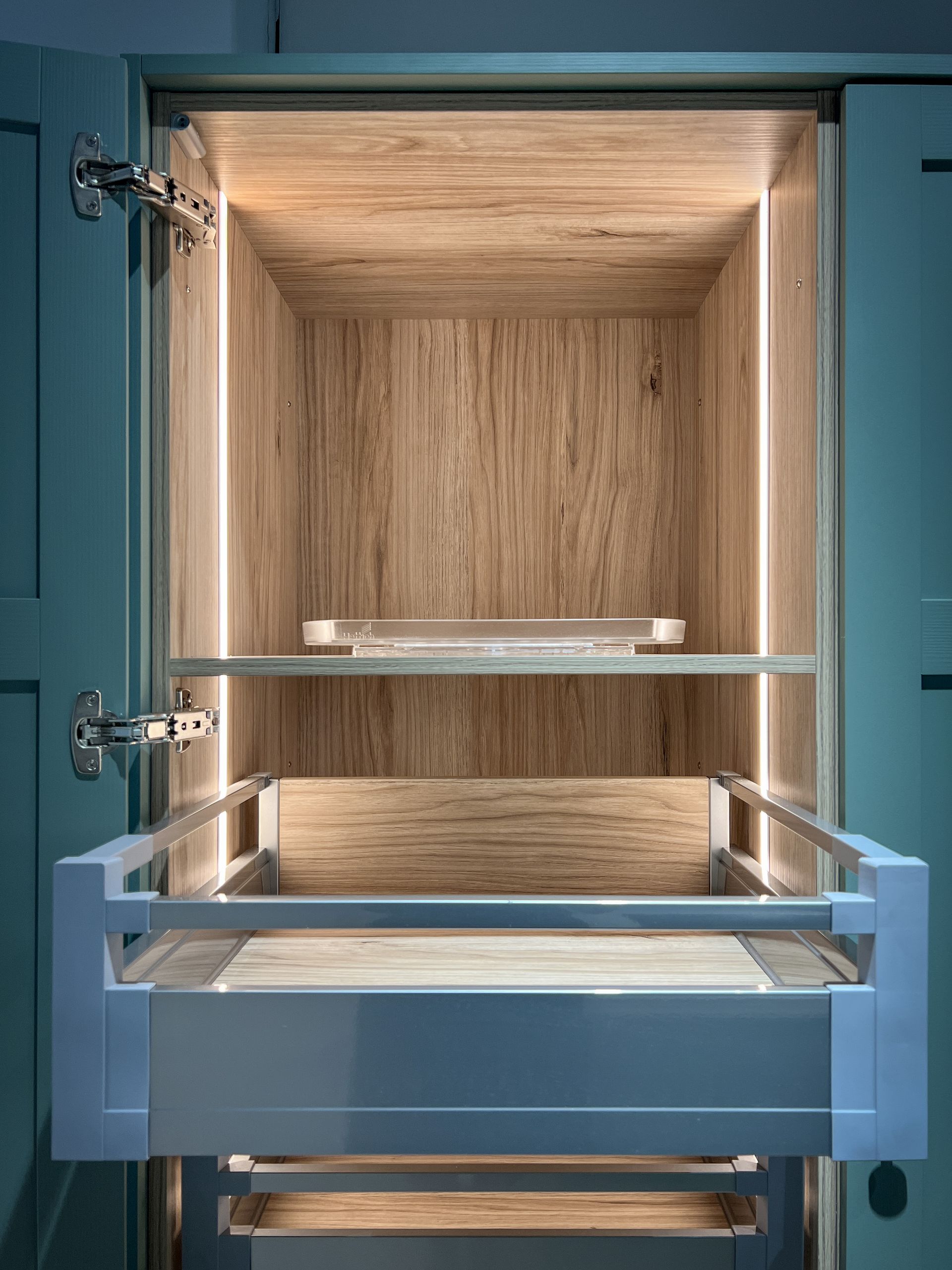 A kitchen full of fresh elegance, dressed in a rich emerald hue with a warm wood breakfast nook.