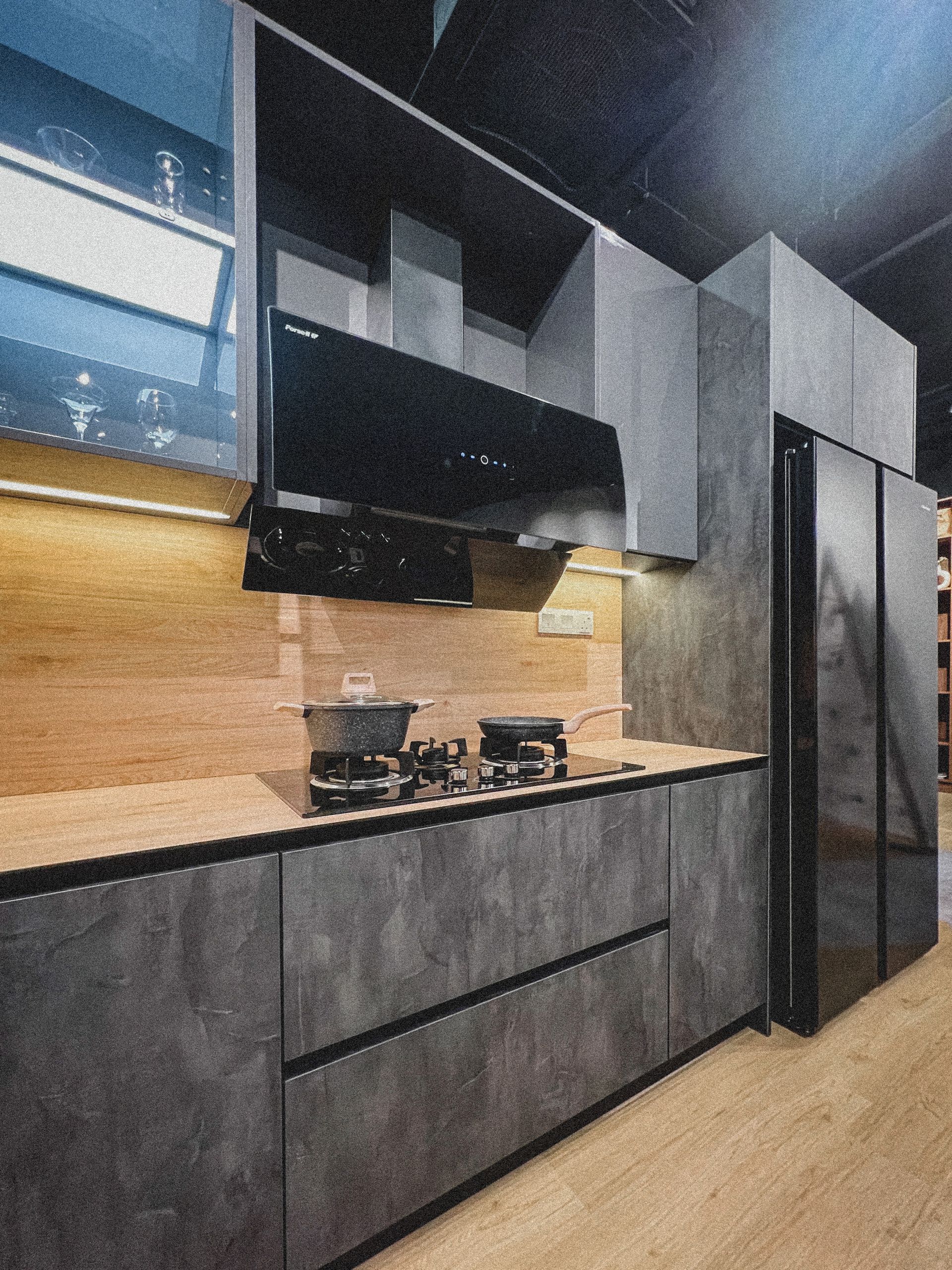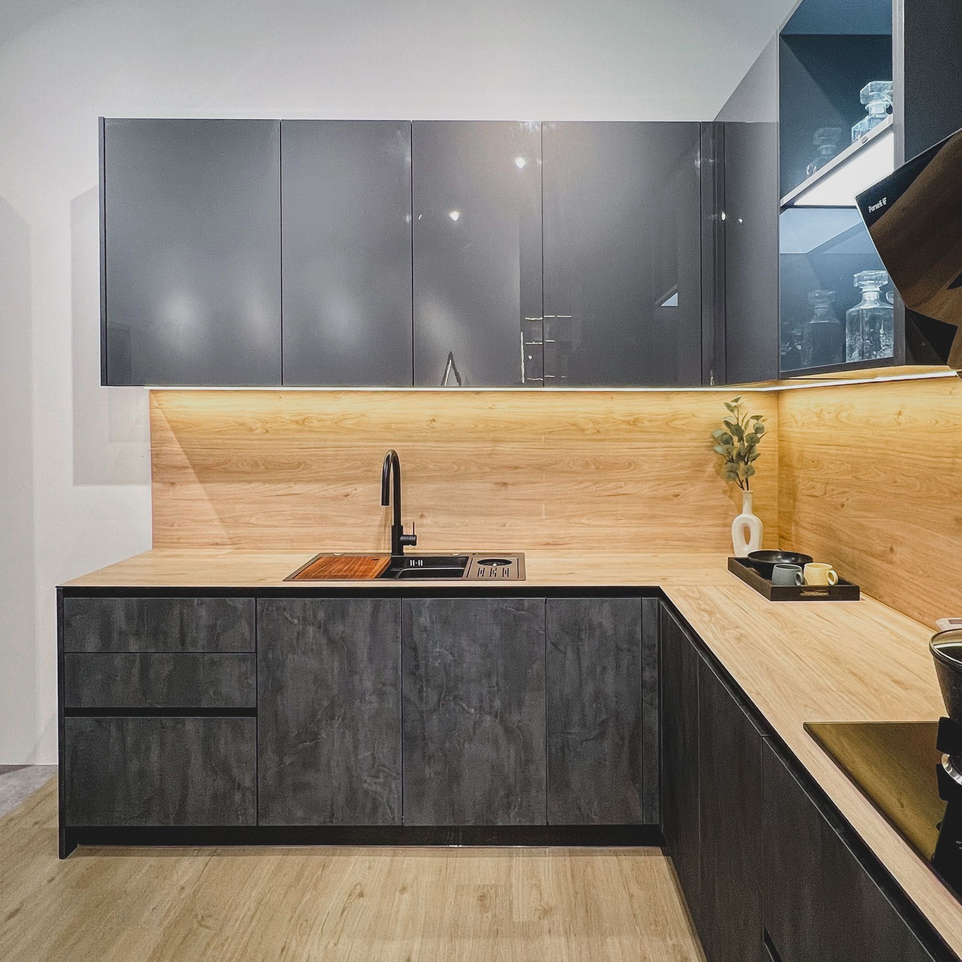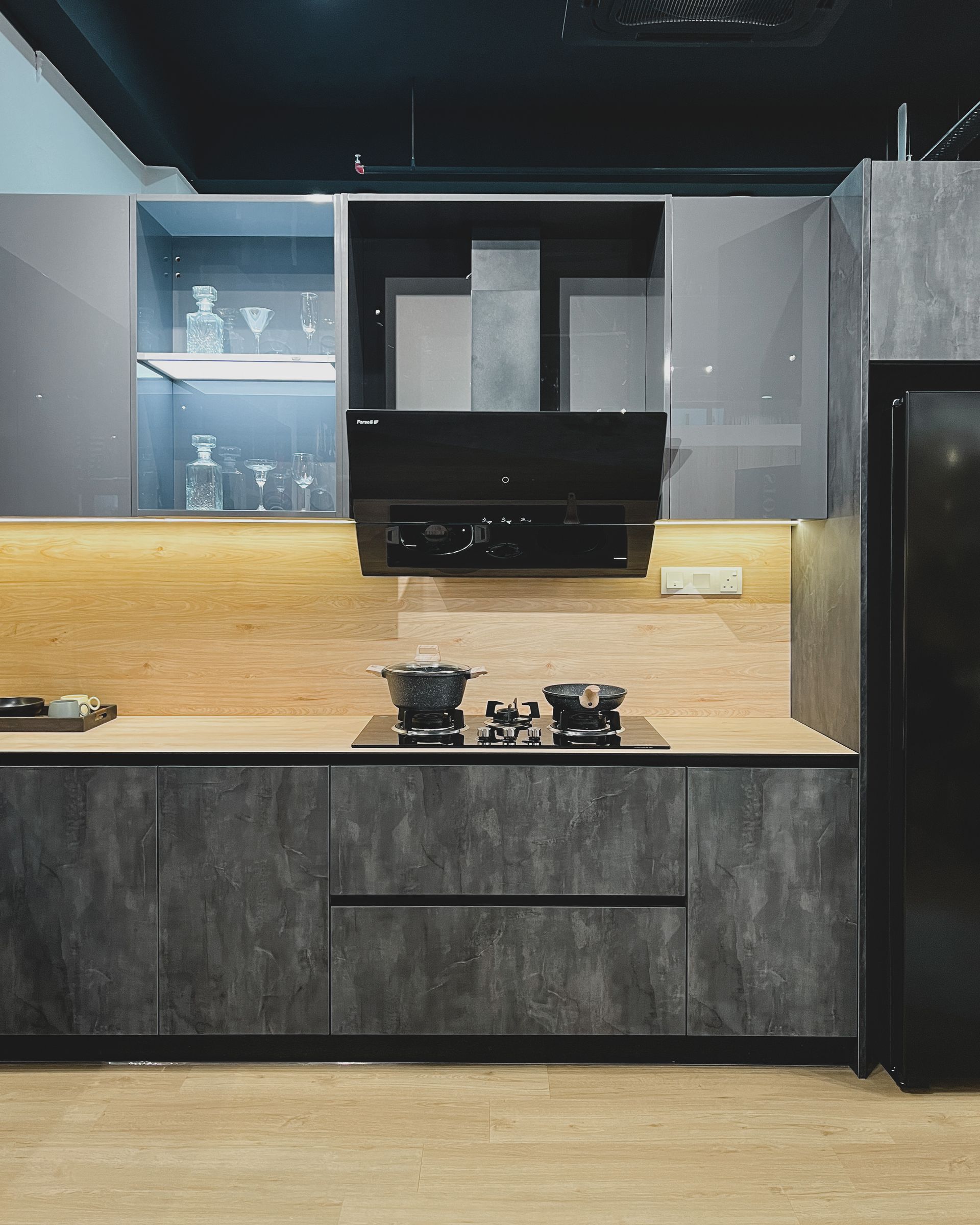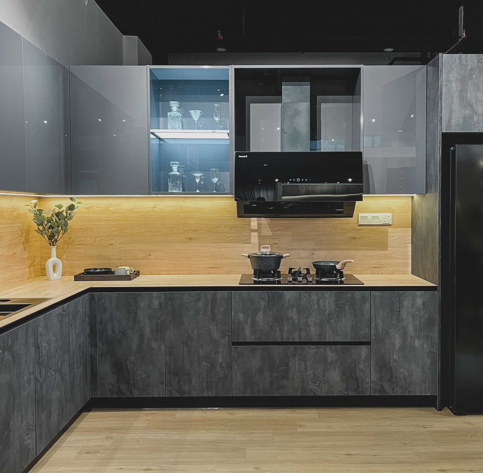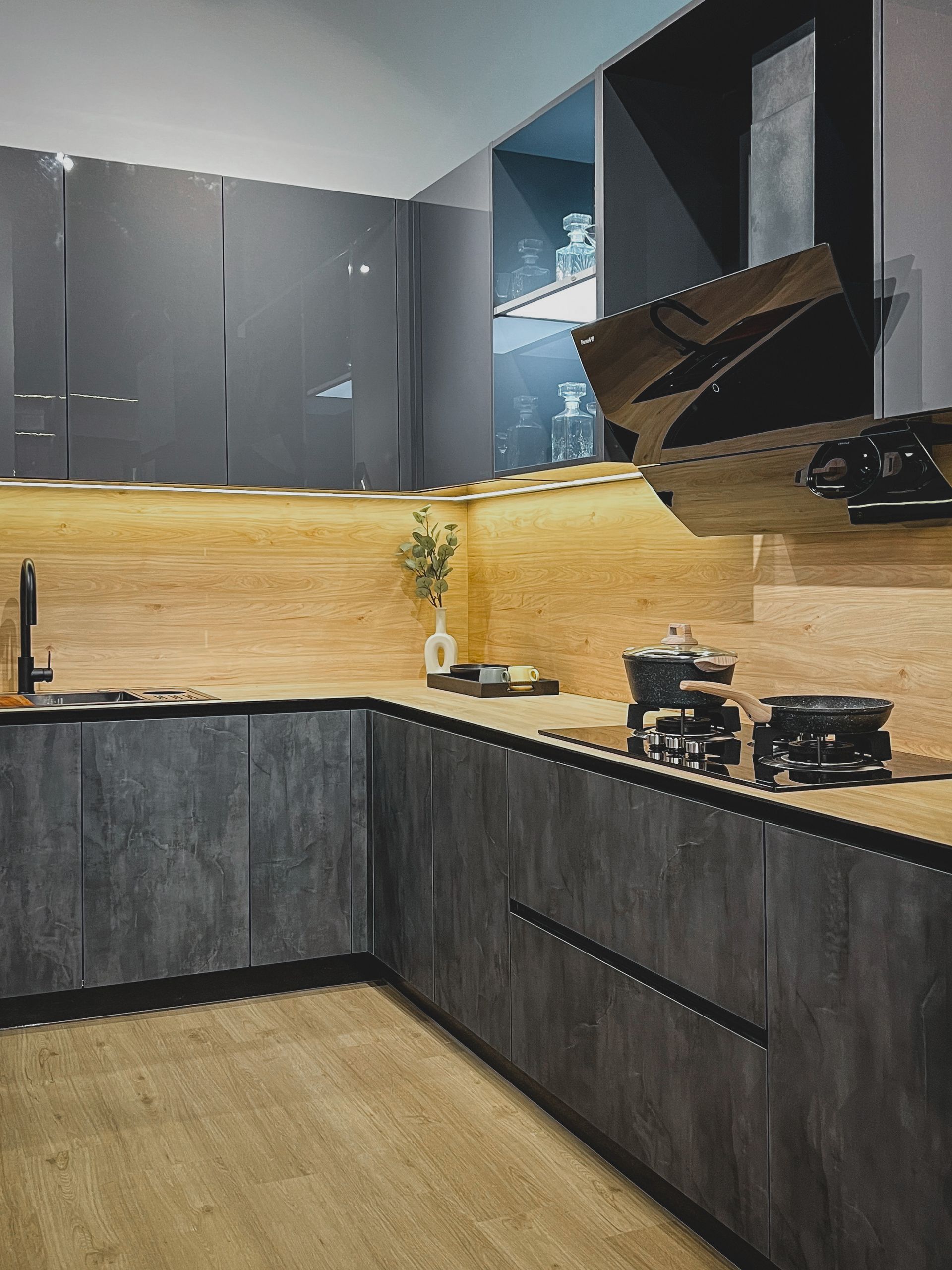 A kitchen that blends modern elegance with rustic charm - warm wood accents meet sleek gray tones for the perfect balance of comfort and style.